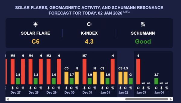 А 3 січня на Землю впливатиме викид корональної маси, який відбувся на Сонці 31 грудня. Це спричинить до подальшого росту геомагнітної активності. На 3 січня прогнозується підйом К-індексу до 6 балів.