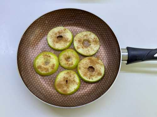 Яблуко нарізаю на шматочки товщиною трохи менше сантиметра і прибираю серцевину. Шкірку з яблук за бажанням можна зняти, але це не обов’язково: після випікання вона стає ніжною й не заважає. Розміщую яблука на дно пательні, посипаю їх цукром і корицею.