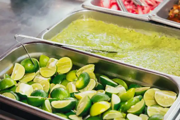 Станція самообслуговування в Santo Taco пропонує страви з лайма, сальси, редиски та чичаррону.