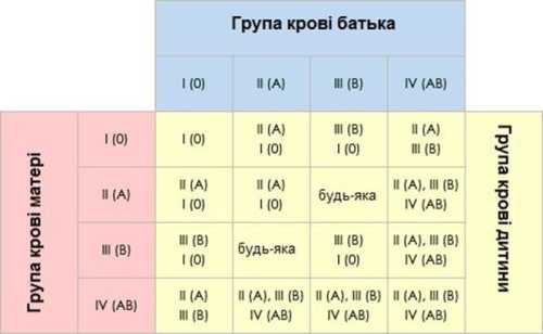 Біологами розроблена таблиця визначення групи крові дитини — в ній зазначені поєднання груп батьків, а також результат, який може спостерігатися у малюка.