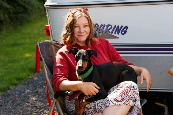 Лотті Гросс у червоному светрі сидить у дверях відкритого фургона, поклавши руку на свого манчестерського тер'єра. Вони знаходяться в стоянці для фургонів, поруч із ними стоять стіл і стілець.