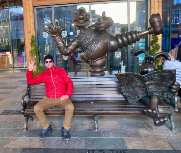 Скульптуру було встановлено у 2021 році, на ній Громіт сидить на лавці та читає газету, а поруч Воллес показує великий палець.