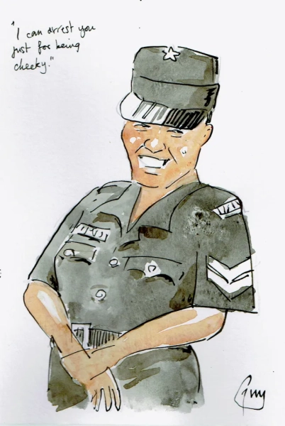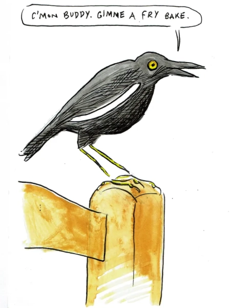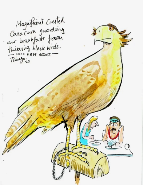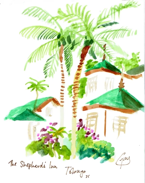 Останні кілька днів ми зупиняємося в готелі Coco Reef Resort на західній мисі затоки Стор-Бей, збудованому з величезною рецепцією та обідньою зоною у стилі атріуму, де не можна пояснити, де зустрічаються внутрішнє та зовнішнє. Як тільки персонал дізнається, що я карикатурист, він схвильовано підводить мене до фотографії Джеральда Скарфа, зробленої там наприкінці 1990-х.
