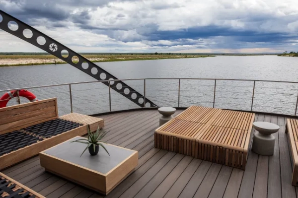 «Вояджер», радше бутиковий плавучий готель, ніж круїзний лайнер, – це африканська королева 21-го століття, що поєднує сучасні технології з розкішшю традиційного річкового судна: комфортні каюти з власними ванними кімнатами, зона відпочинку та їдальня, де кухарі подають нам вечері з трьох страв, і тераса для засмаги, з якої я спостерігаю за пейзажами, що пливуть повз, з джином «Окаванго» в одній руці та фотоапаратом в іншій. Про всяк випадок.