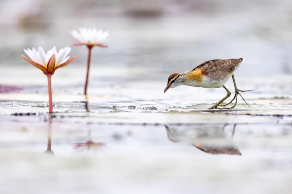 Ми відвідуємо «Країну лілій», названу так на честь її плавучої луки з білими та фіолетовими водяними ліліями, де ми спостерігаємо, як африканські жакани, або «птахи Ісуса», ніби ходять по воді, перестрибуючи з поля на поле в пошуках комах.